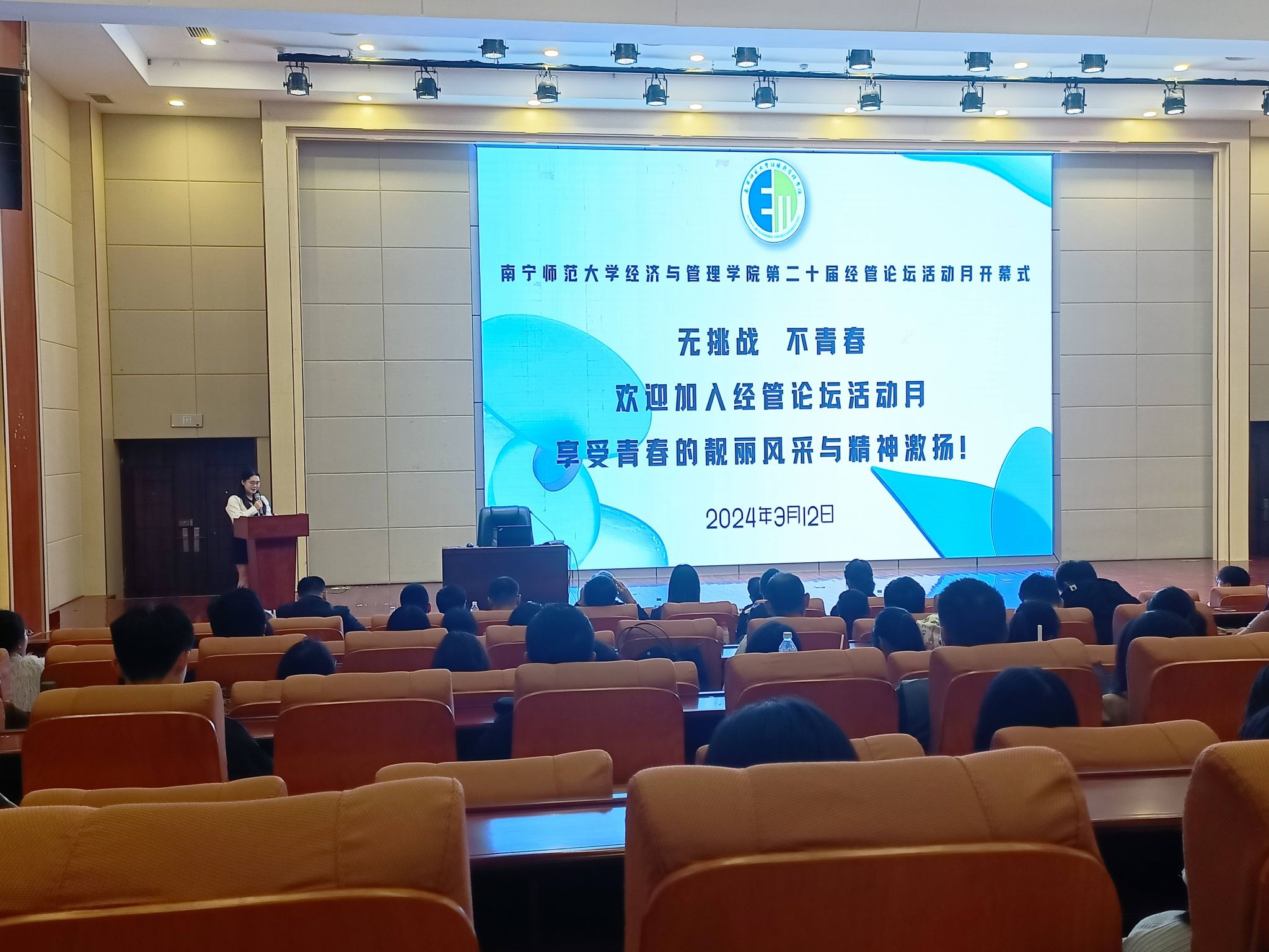 公司韦海鸣经理代表公司致开幕词。韦经理介绍了经管论坛活动月二十年的发展历程,介绍了“我与MPA面对面”大讲堂、营销策划大赛、社会问题调查设计大赛、文化创意大赛、模拟竞聘大赛、商务精英挑战赛和经管论坛活动月闭幕式暨毕业生晚会等主要活动安排,鼓励同学们踊跃参与到各项活动比赛中去。韦经理指出,希望同学们能够积极参赛,以赛促学、以赛促进,学以致用,有所成长。在全程热烈的掌声中,韦经理宣布第二十届经管论坛活动月正式开幕。