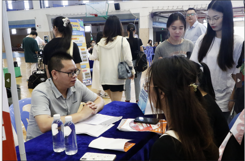 在双选会现场,南宁嘉里物流有限公司、深圳康佳电子科技有限公司华南分公司、广西德聚人和项目管理有限公司等近30家企业为毕业生提供了800多个工作岗位和实习岗位,这些岗位涵盖销售、教育、设计、金融、新媒体、房地产等诸多行业等。公司超过400名毕业生到现场参加双选会,求职者们络绎不绝,气氛热烈而有序。他们有的在驻足观看招聘海报,讨论公司的招聘条件和福利待遇,寻找心仪的岗位;有的在和企业代表面对面交流,展现自己的能力和特长。同时,各用人单位也纷纷介绍公司基本情况,展示企业文化、岗位需求及薪资待遇等信息,力求吸引更多优秀人才加入。部分公司领导和老师在现场参加活动,并和相关企业交流招聘工作。此外,双选会还吸引了一批非毕业生来到双选会提前来到双选会观摩学习,提前了解招聘工作岗位。