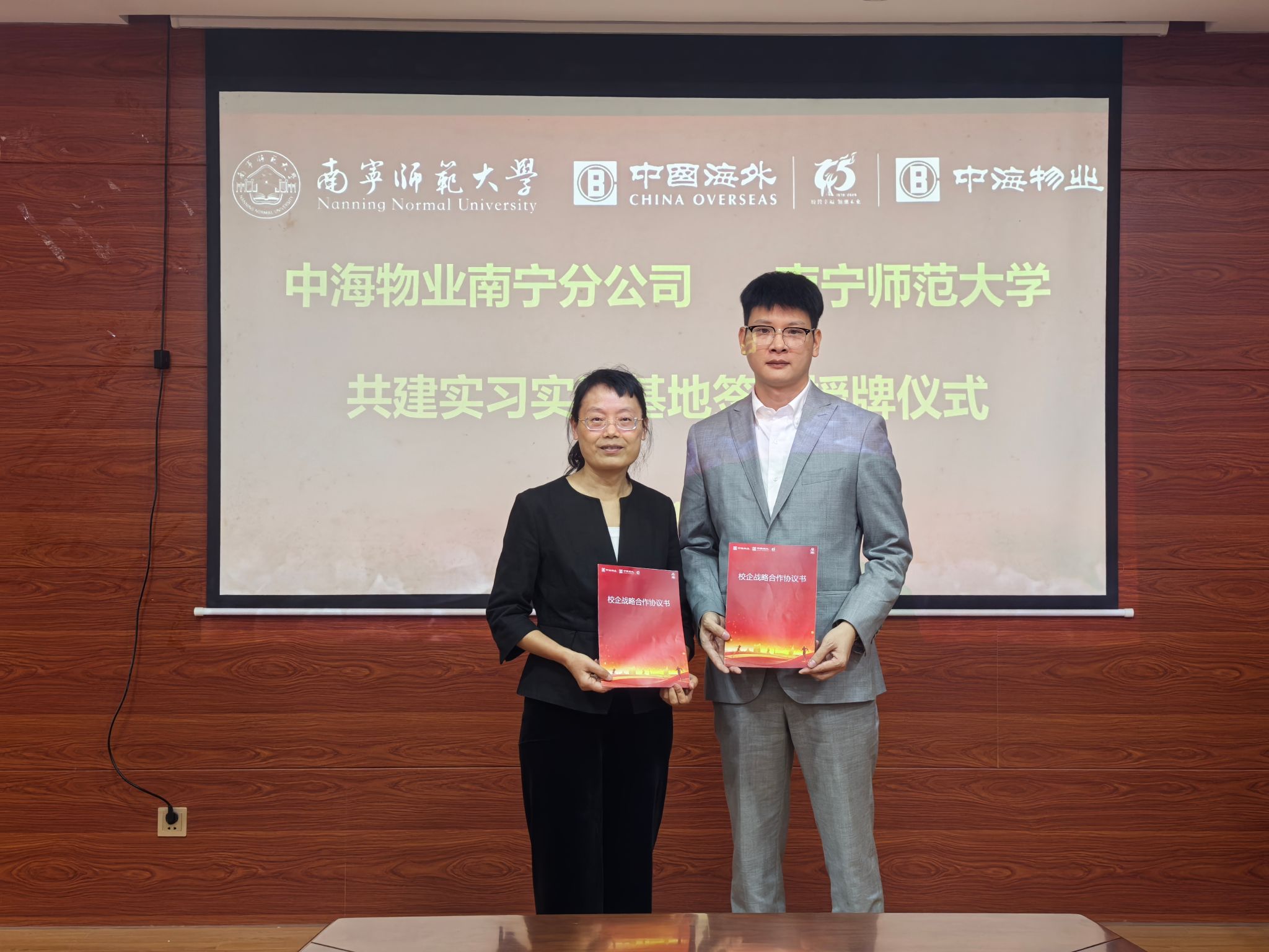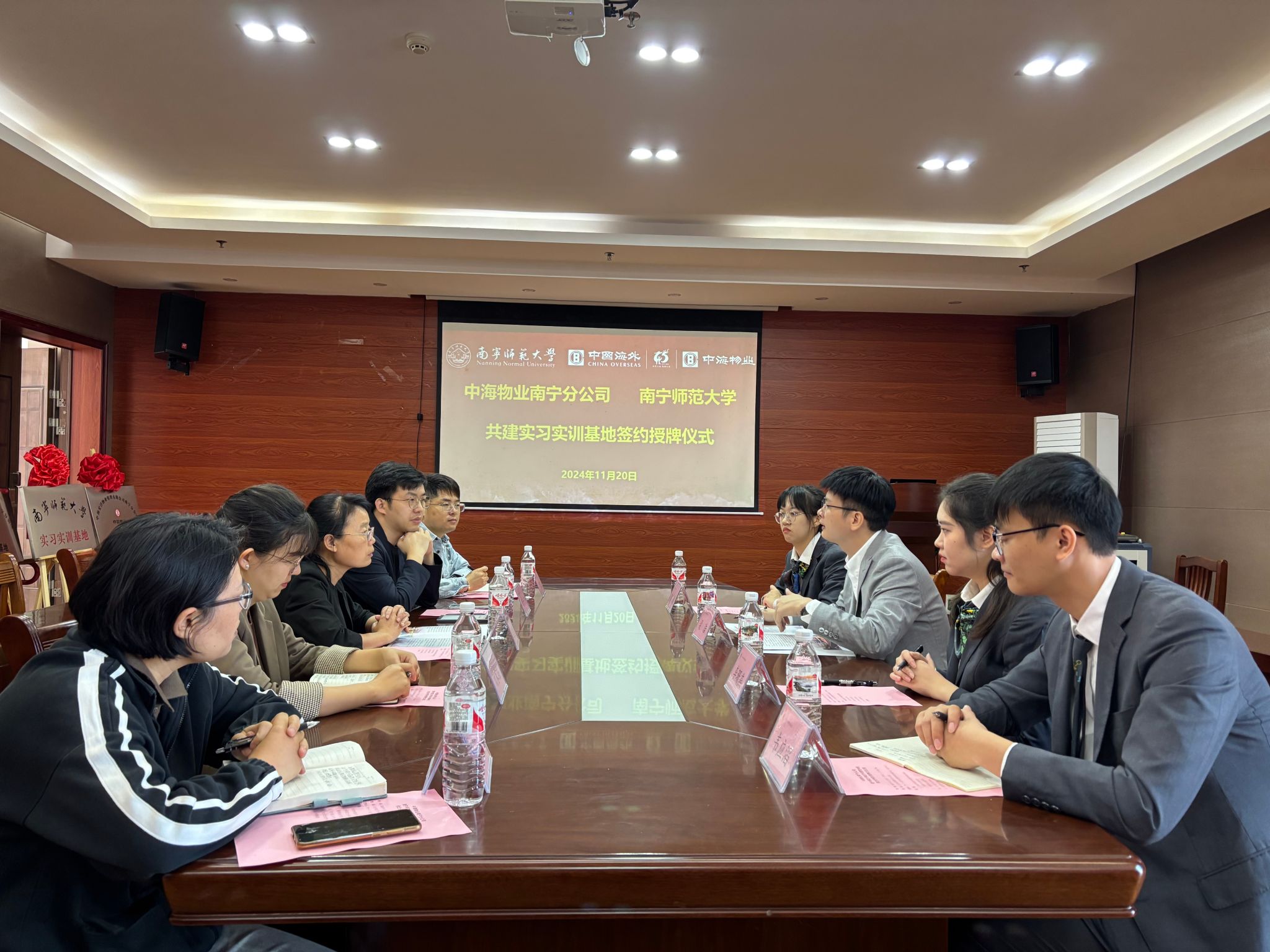 2024年11月20日,太阳成tyc7111cc与中海物业南宁分公司在五合校区理综515举办校企战略合作签约授牌仪式。中海物业南宁分公司人事行政部经理梁浩一行,太阳成tyc7111cc(主持行政工作)副经理何玲玲,党委副书记、纪委书记何一飞,团委书记刘家瑶出席仪式。会上,公司(主持行政工作)副经理何玲玲介绍了公司的专业设置、培养模式及毕业生的就业方向,希望双方共同推动人才培养与产学研建设的深入合作。中海物业南宁分公司人事行政部经理梁浩介绍了公司的发展脉络、人才培养理念、校企合作经验等内容,表达了与公司加强合作的愿望。他指出,非常欢迎和邀请公司毕业生到中海物业工作,实现自身的职业梦想。
