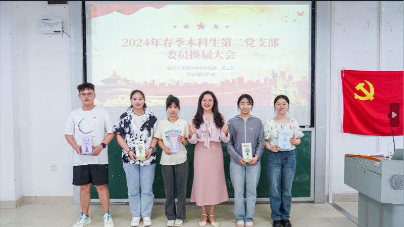 随后,支部大会讨论了支部委员换届的相关事宜。按照《中国共产党章程》和《中国共产党基层组织选举工作条例》有关规定,大会采取无记名投票的方式选举产生了新一届支部委员会委员,陆柳政等5名同志为支部委员。支部委员会召开会议选举产生书记、副书记,刘家瑶同志为新一届支部委员会书记,会议还研究确定了委员分工。刘家瑶老师对老一届支委的辛勤付出表达了感谢,并为他们送上了纪念礼物。她表示,希望新一届支部委员尽快转变角色,在工作中起到先锋带头作用,肩负起重任继续带领支部开创未来,带领大家奋勇向前。