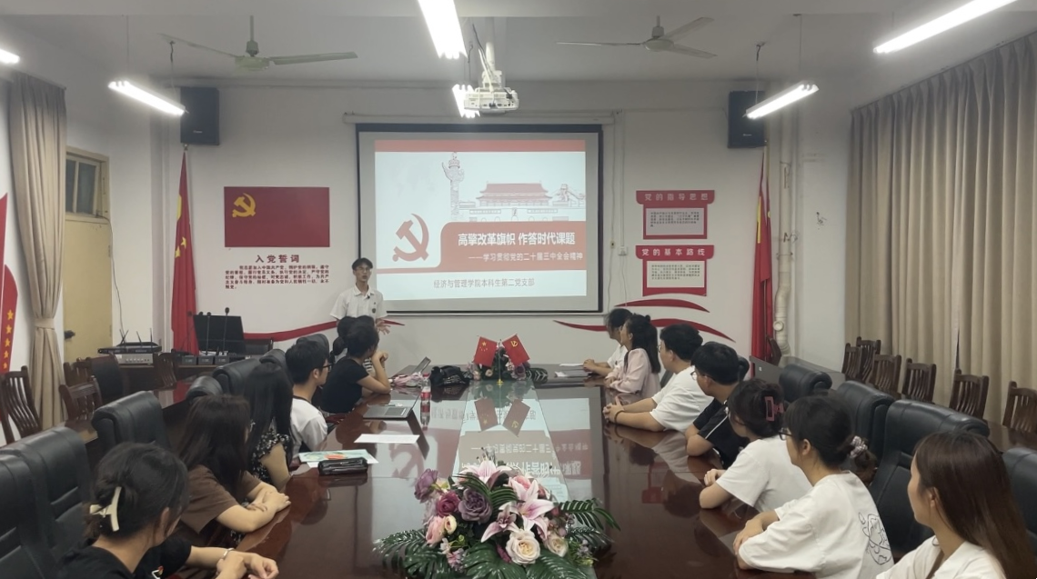 为进一步推动学习贯彻党的二十届三中全会精神走深走实,9月27日晚,太阳成tyc7111cc本科生第二党支部在明秀校区开展“高擎改革旗帜 作答时代课题”主题党课,此次党课由支部副书记陆柳政同志主讲,支部全体在公司党员参加听课。