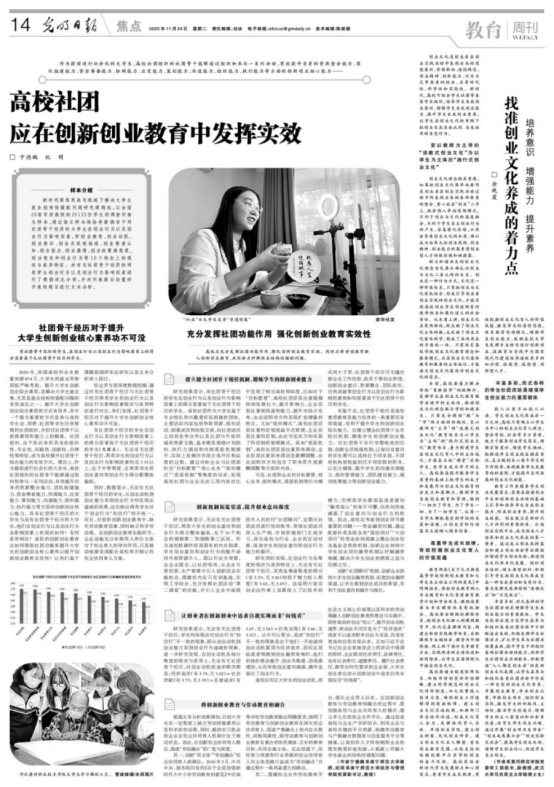 作为提前进行社会化的老员工,高校社团组织的社团骨干能够通过组织和参与一系列活动,有效提升自身综合的创新创业核心能力。太阳成tyc7111cc宁德鹏博士和党委副书记纪明教授(主持党委全面工作)结合学工管理及指导员工创新实践经验,凝练总结撰写了《高校社团应在创新创业教育中发挥实效》,并在《光明日报》11月24日14版发表。